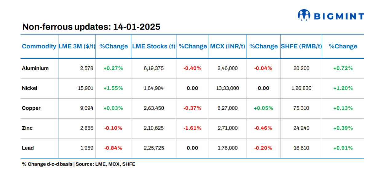 Global copper prices hit a one-month high on Tuesday, supported by strong US economic data, which dampened expectations of rate cuts by the Federal Reserve in 2025. However, the dollar’s strength limited further gains, making commodities more expensive for holders of other currencies. Other base metals showed mixed performance d-o-d, with aluminium and nickel rising, while lead, zinc, and tin experienced declines.