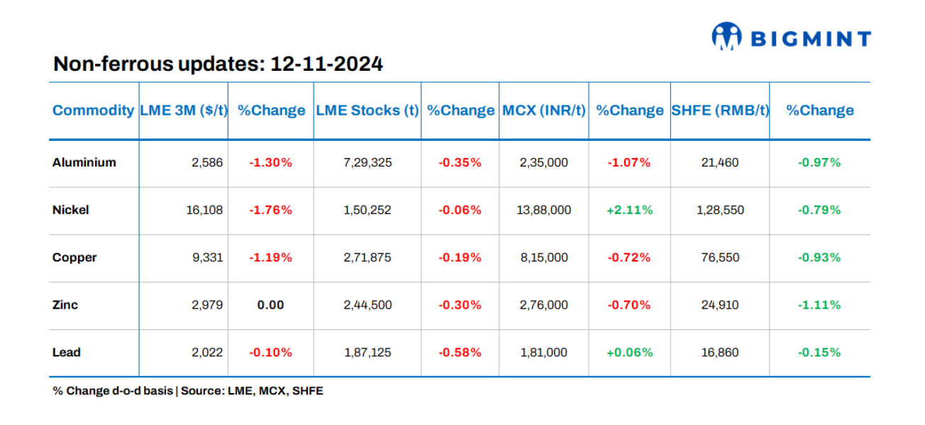 Base metals prices on the London Metal Exchange (LME) showed negative trends, with nickel losing 1.76% d-o-d. Meanwhile, stocks at LME-registered warehouses witnessed outflows, with lead decreasing by 0.58% d-o-d.