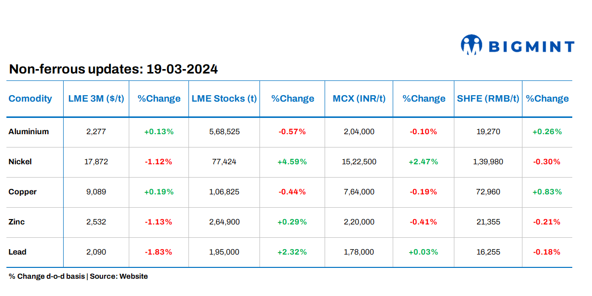 On Monday’s closing, 18 March, base metals prices on the London Metal Exchange (LME) showed mixed trends. Meanwhile, stocks on the LME registered warehouses showed varied trends with nickel experiencing highest inflows among all base metals.
