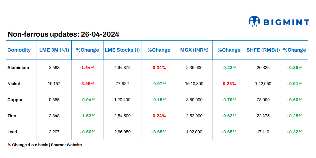 Base metals prices on London Metal Exchange (LME) witnessed varied trends at yesterday’s closing with the highest drop seen in nickel. Meanwhile, India’s domestic market also witnessed mixed trends aligned with the global market. LME nickel reached $19,775/t, up 15% in 2024. Oversupply persists, INSG predicts 109,000 t surplus. Anglo American rejected BHP’s 31.1 billion pound takeover bid, citing undervaluation.