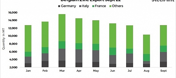 - Belgium exported 12,787 t of zinc semi-finished products in Sept’22, a rise of 23% m-o-m compared to 10,370 t in Aug’22, as per Customs data.