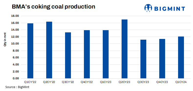 BHP Mitsubishi Alliance’s (BMA’s) coking coal (100% basis) production for Q1CY’24 was recorded at 12.1 million tonnes (mnt), dropping by 13% as against 13.9 mnt recorded in Q1CY’23.