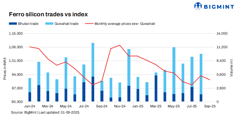 Bhutanese sellers have reduced ferro silicon offers by INR 9,000/t ($102/t) m-o-m to INR 86,000/t ($976/t) in Sep’25. The decline is likely driven by limited inquiries, increased imports, and easing Chinese silicon metal (553 grade, Si:98.5%) prices, which slipped $6/t m-o-m to $1,369/t CFR Mundra in Aug’25.