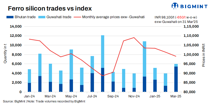 Bhutan’s ferro silicon offers for Apr’25 were announced at INR 96,500/t ($1,128/t) exw, reflecting a drop of INR 3,500/t ($41/t) m-o-m, as per reliable sources. The drop was likely driven by competitive prices of imported material, which have dampened demand for domestic ferro silicon. Additionally, major mills have ample inventory and are not in a rush to procure additional stock.