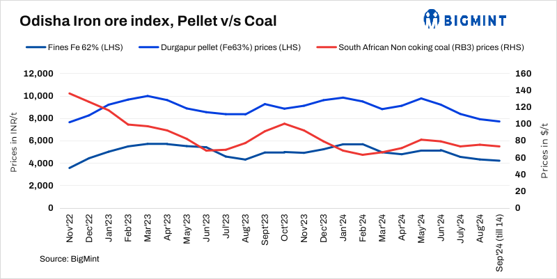 • Pellet prices stable w-o-w: Pellet (6-20 mm, Fe 62.5%) prices in Odisha’s Barbil inched down w-o-w. The current assessment stands at INR 7,000/t ($83/t) loaded to wagon. Pellet (Fe 62.5%, 6-20 mm) prices in Durgapur remained stable at INR 7,700/t ($92/t) exw on 13 September. BigMint’s India pellet (Fe 63%, 3% Al) export index (FOB east coast) increased by $1.5/t w-o-w to $85/tonne (t) on 13 September and no pellet export deal was recorded in the last one week amid lack of buying interest.