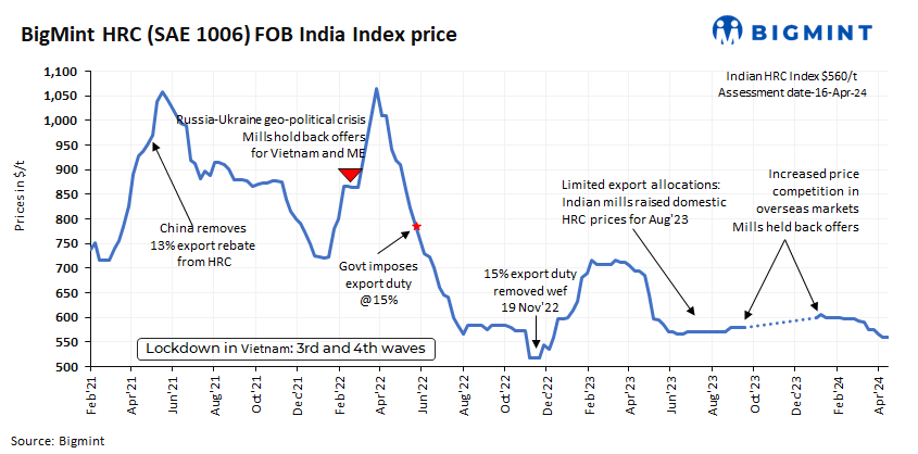 BigMint’s India HRC (SAE 1006) export index (for the Middle East and Vietnam) remained range-bound w-o-w to around $560/t FOB east coast India. The index remained range-bound as some of the major Indian mills halted export offers due to planned maintenance, resulting in fewer active offers. However, offers to the Middle East (ME) decreased w-o-w due to reduced market activity following Eid holidays and the regional tensions due to geo-political conflicts. Similarly, offers to Europe (EU) also declined w-o-w due to sluggish demand in the European market.