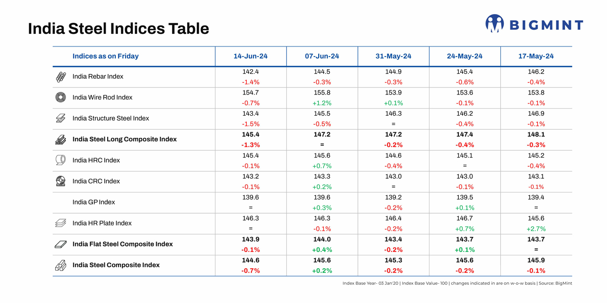 Morning Brief: The BigMint India Steel Composite Index, after flickering positively for a week, fell back again into negative zone. The index dipped weekly 0.7% to close at 144.6 points (145.6) on 14 June, 2024.