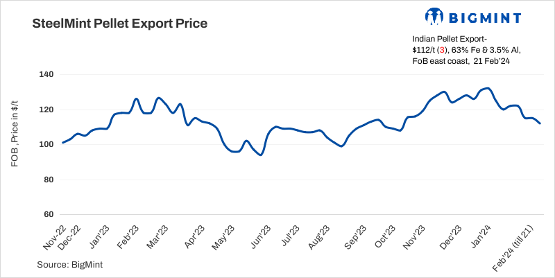 BigMint’s India pellet (Fe 63%, 3% Al) export (FOB east coast) index fell by $3/t to $112/t on 21 February 2024. No deals were recorded from the east coast of India in this publishing window amid bid-offers disparity between buyers and sellers. Export prices fell as iron ore futures on the Dalian Commodity Exchange (DCE) for May 2024 contract sharply decreased by $10/tonne post the Lunar New-Year holidays.