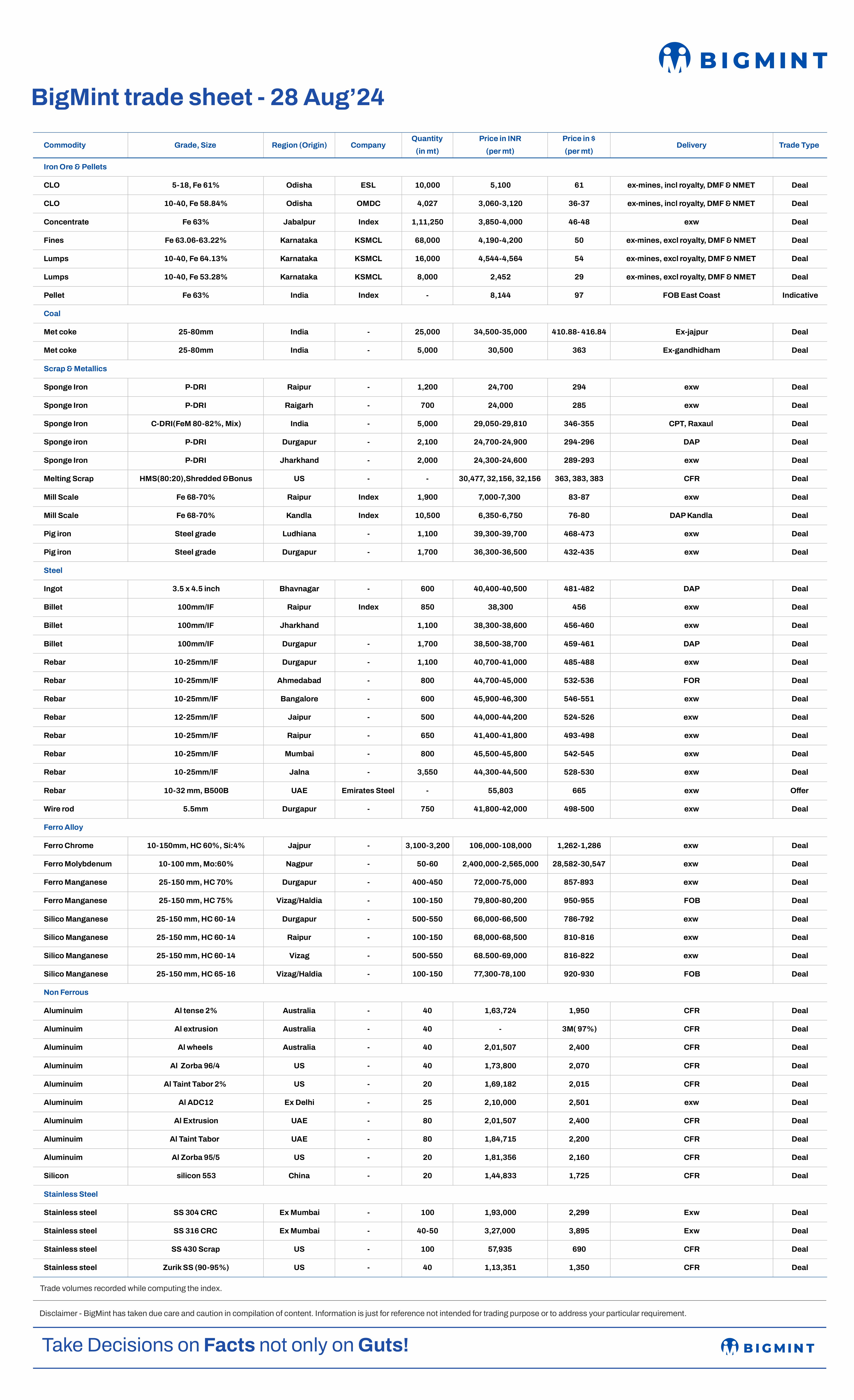 The following sheet summarises confirmed trades/offers of iron and steel products collected by BigMint to help our users keep track of day-to-day trade dynamics.