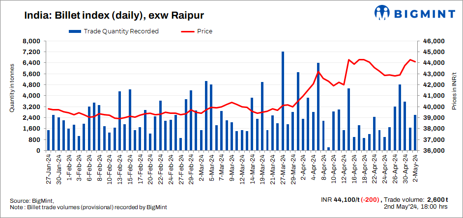 BigMint’s billet index fell by INR 200/t, to INR 44,100/t exw-Raipur on May 2, 2024.