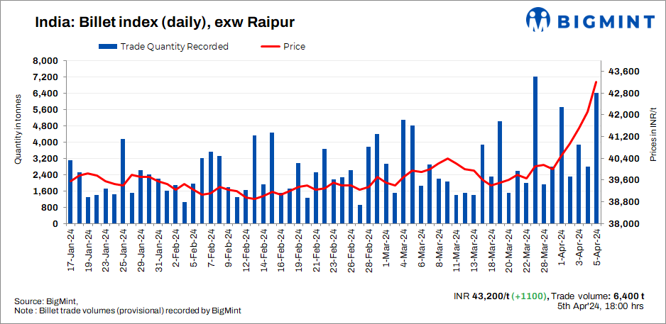 BigMint’s billet index increased by INR 1,100/t to INR 43,200/t exw Raipur as on 5 April, 2024.