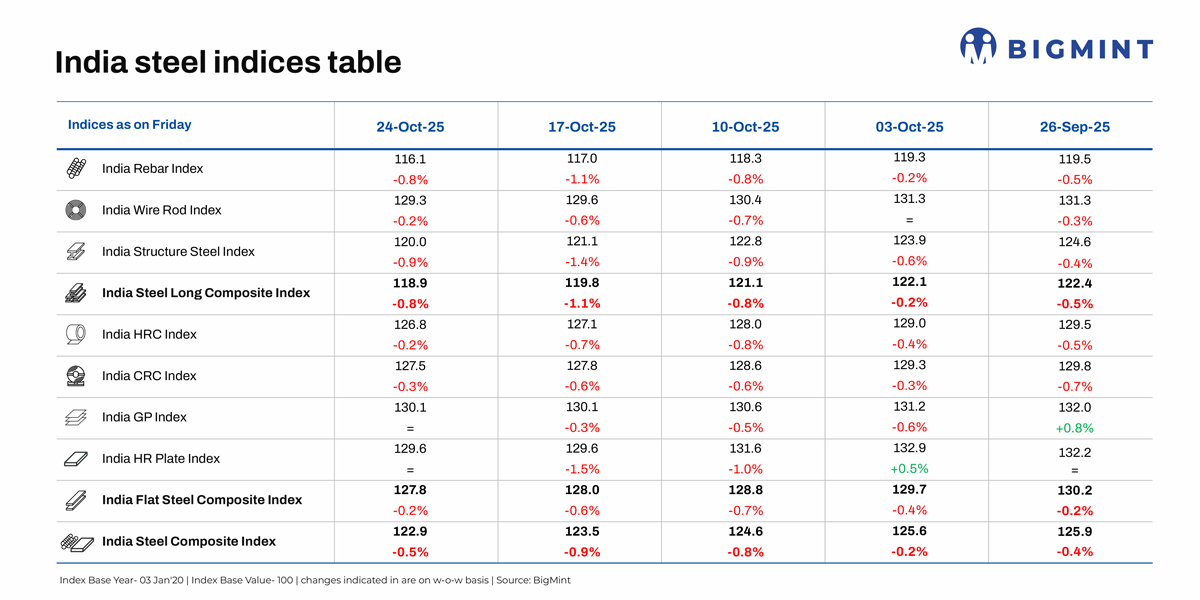 Morning Brief: BigMint’s flagship India steel composite index, a barometer of the domestic steel market, edged down by 0.5% w-o-w, as assessed on 24 October 2025. The continued downtrend, with steel prices dropping to 5-year lows, points to the combined impact of festive slowdown and inventory pressure in the domestic market.