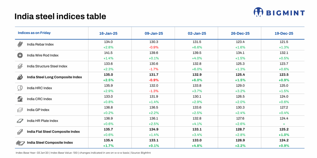 Morning Brief: BigMint’s flagship India steel composite index edged up by 1.7% w-o-w, as last assessed on 16 January 2026, at a faster pace compared with the previous week. The longs composite index posted a gain of 2.5% w-o-w compared with 0.6% for flats.