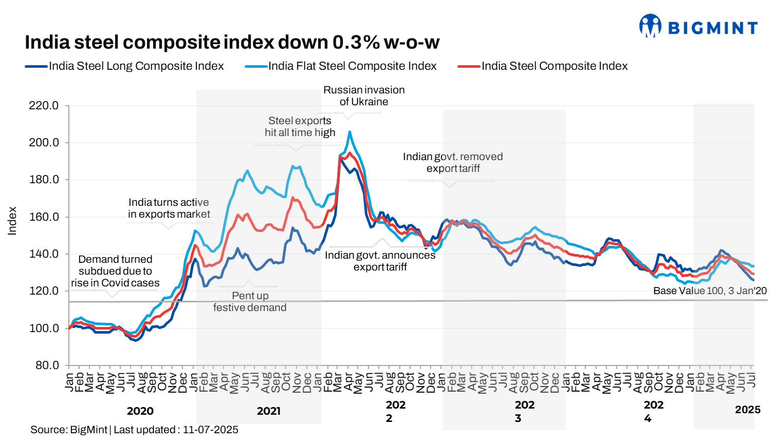 Morning Brief: BigMint’s India steel composite index, a barometer of the domestic market and steel prices, edged down by 0.3% w-o-w on 11 July 2025, reflecting a steady downtrend in the domestic steel market.