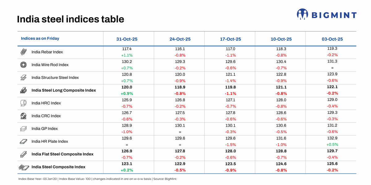 Morning Brief: BigMint’s flagship India steel composite index, a barometer of the domestic steel market, edged up by 0.2% w-o-w as assessed on 31 October 2025, marking a rare uptick amidst the sustained downtrend in the steel market and after a spell of 11 weeks of successive decline.
