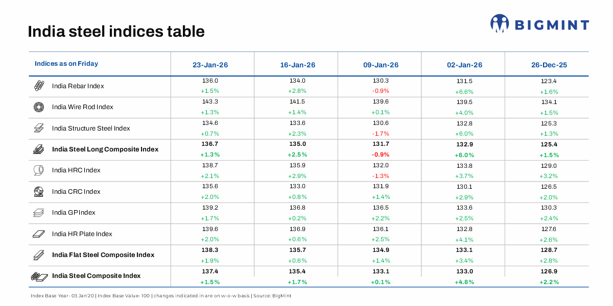 Morning Brief: BigMint’s flagship India steel composite index, a barometer of the domestic steel market, recorded an increase of 1.5% w-o-w in the week ending 23 January 2026. While the long steel index rose by 1.3%, the flats index climbed 1.9% w-o-w as steel prices rebounded after hitting five-year lows in November and December.