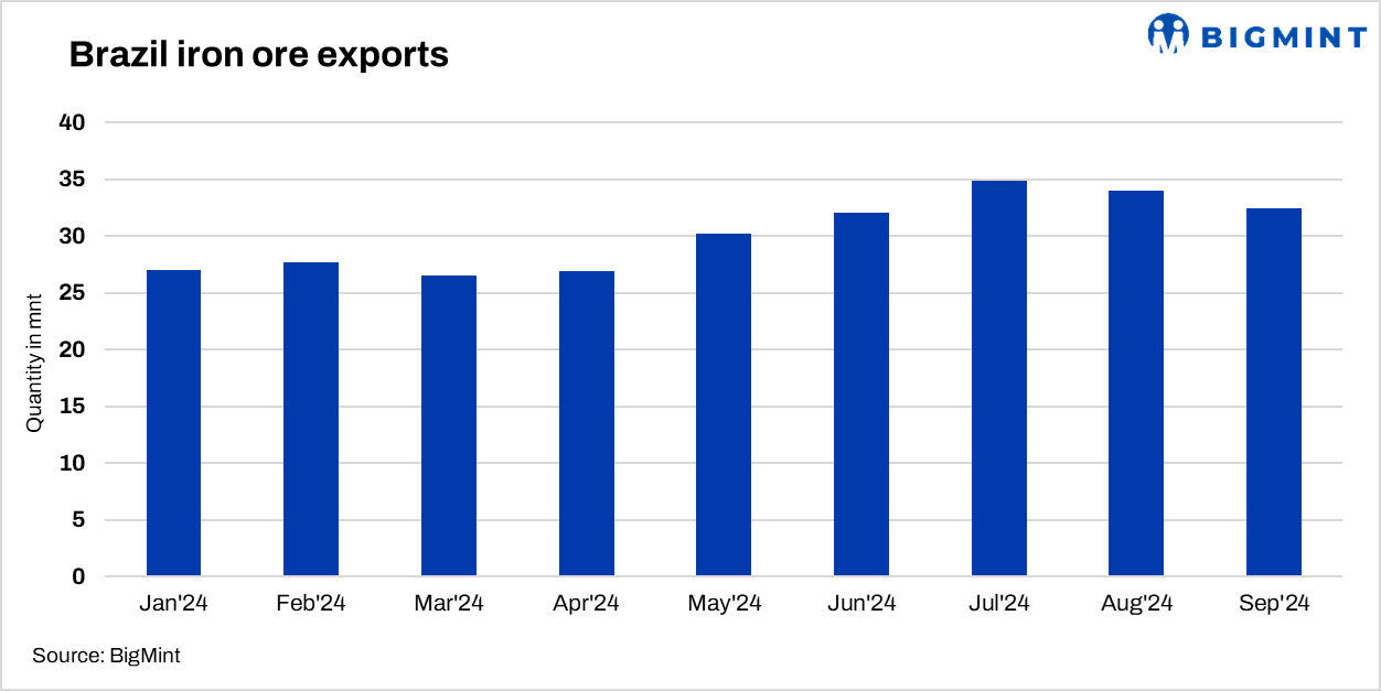 Brazil’s iron ore exports fell 4% m-o-m to 32.51 million tonnes (mnt) in September 2024 compared to 34 mnt in August, as per vessel line-up data maintained with BigMint.