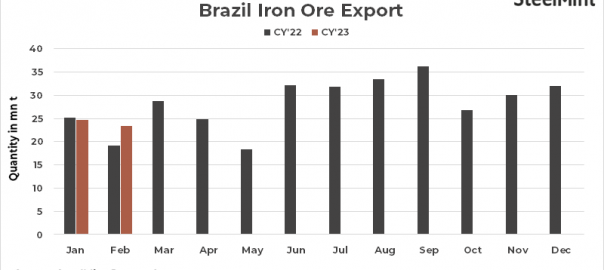 • Brazil’s iron ore exports decreased marginally by 5% m-o-m in Feb’23 to 23.41 mnt compared to 24.69 mnt in Jan’23, customs data showed. Exports declined due to less number of working days.