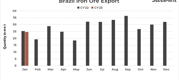 • Brazil’s iron ore exports sharply decreased by 23% m-o-m in Jan’23 to 24.69 mnt compared to 32.02 mnt in the previous month, as per Customs data.