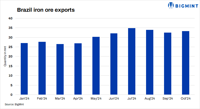 Brazil’s iron ore exports edged up by 3% m-o-m to 33.33 million tonnes (mnt) in October 2024 compared to 32.51 mnt in September, as per vessel line-up data maintained with BigMint.