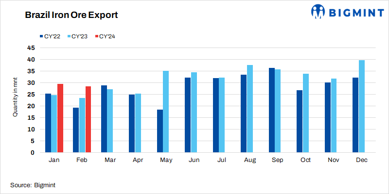 - Brazil’s iron ore exports rose by 21% y-o-y to 28.3 mnt in Feb’24 compared to 23.3 mnt in Feb’23, as per Customs data.
