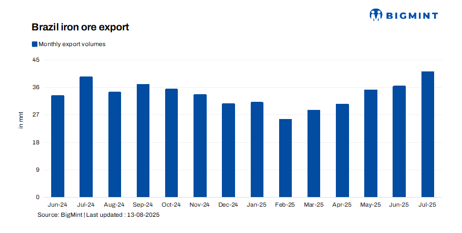 - Brazil’s iron ore exports rose 4.7% y-o-y to 41.1 mnt in Jul’25, compared to 39.3 mnt in Jul’24, as per customs data.