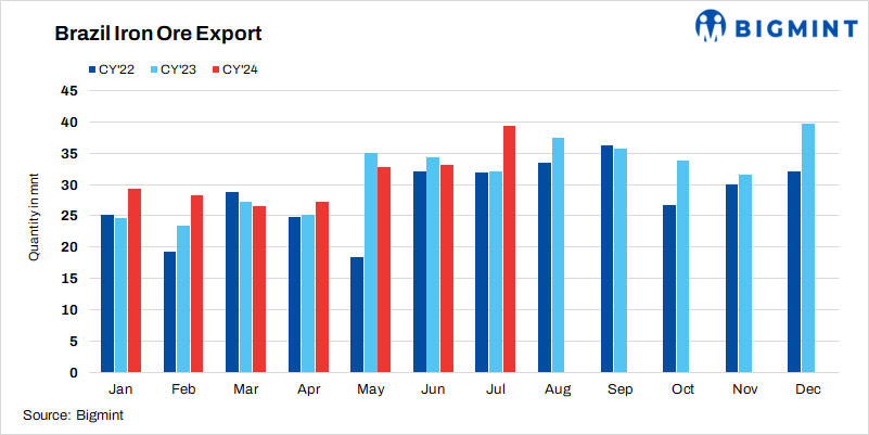 • Brazil’s iron ore exports rose by 24% y-o-y to 39.31 mnt in Jul’24 compared to 31.71 mnt in Jul’23, as per Customs data.