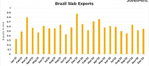 - Brazil’s steel slabs exports improved by 5.6% m-o-m to 553,792 t in Dec’22 as against 524,182 t in Nov’22, as per customs data.