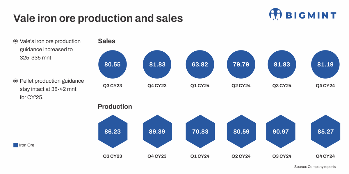 - Vale’s iron ore production guidance has been increased to 325-335 mnt for CY’25 from the previous 323-330 mnt.
