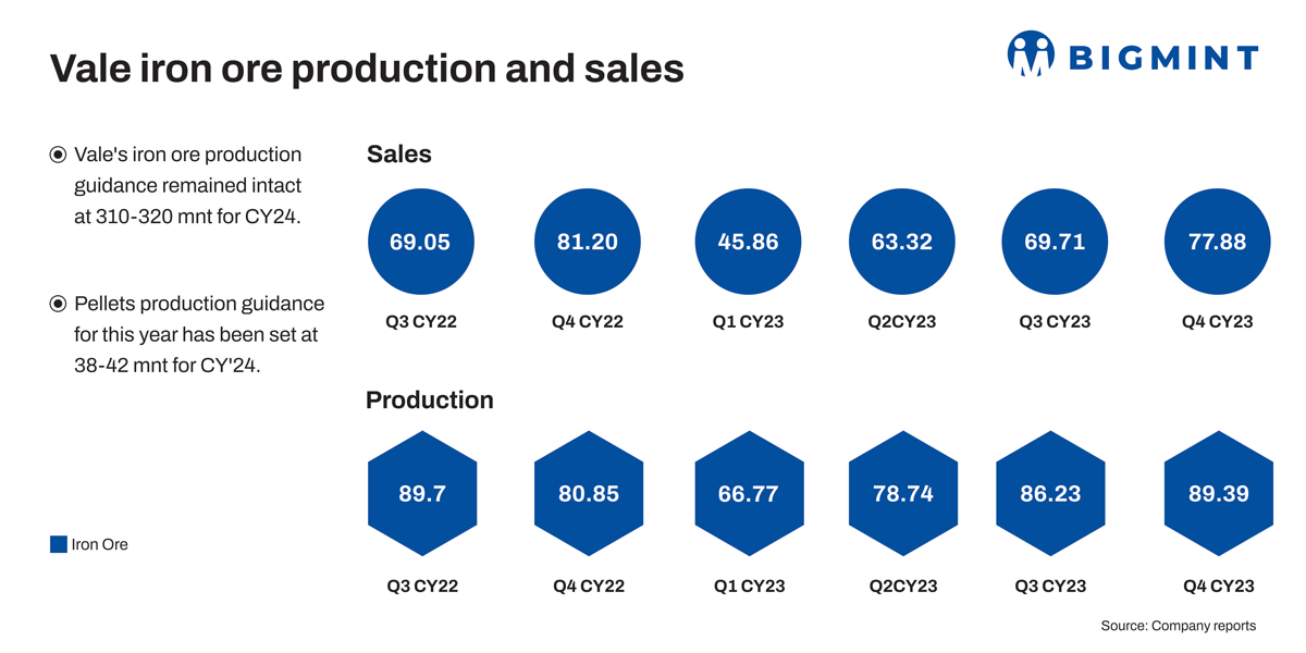 - Vale recorded iron ore production at 89.39 mnt in Q4CY23 (October-December 2023), up by 3.7% q-o-q as against 86.23 mnt in Q3CY23 (July-September 2023). The iron ore production increased by 10.6% y-o-y compared to 80.85 mnt in Q4CY22.