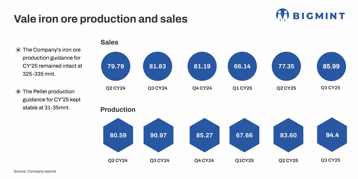 Brazilian miner Vale recorded total iron ore production of 94.4 million tonnes (mnt) in Q3CY’25, up sharply by 12.9% from 83.6 mnt in Q2CY’25.The sharp increase in production, driven by the ramp-up of new assets and improved operational reliability, lifted output to its highest level since 2018 and contributed to stronger price realization during the quarter.