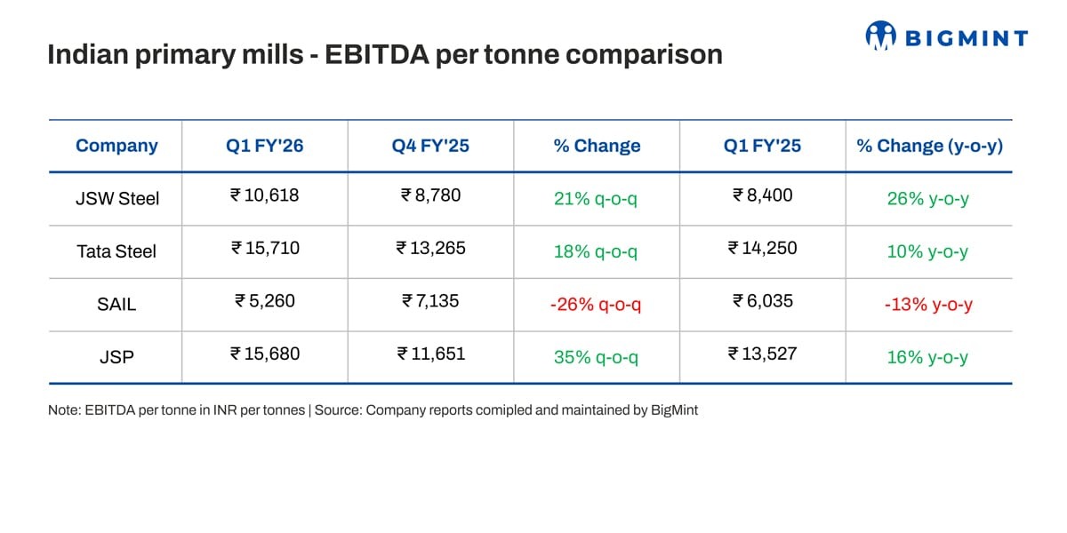 Indian steel mills are projected to report a y-o-y growth in their EBITDA per tonne for September quarter (Q2FY26), although growth rate can come down from the high seen in Q1FY26. Aggregate EBITDA per tonne of the top four steel producers is expected to range between INR 10,300-10,600 during Q2FY26, higher by about 2-4% on y-o-y basis but sequentially lower by 5-8% q-o-q. In Q1FY26, aggregate EBITDA per tonne had risen by about 9% on y-o-y basis.