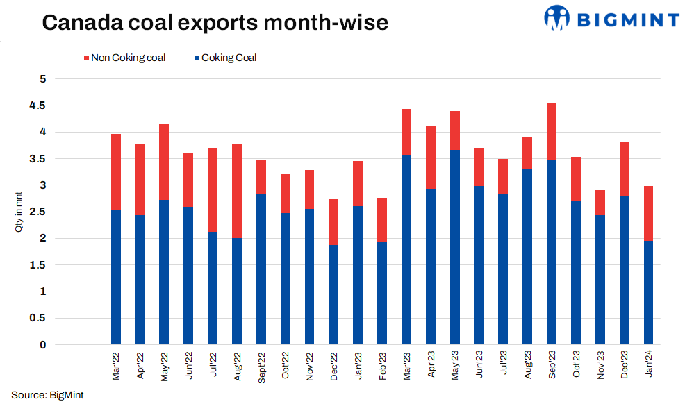 Canada’s coal exports rose by 11% m-o-m to 7.68 mnt in Feb’24 as against 6.84 mnt in Jan. The country exported the highest volume to South Korea at 1.58 mnt (up by 9% m-o-m) followed by the Netherlands at 0.89 mnt as against 0.52 mnt in Jan. Meanwhile, shipments to China plunged to 0.32 mnt in the month under review. Notably, no exports were recorded to India in Feb.