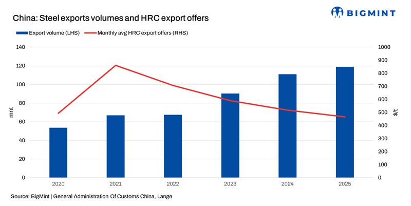 China’s total steel exports in 2025 reached a record high of 119.02 mnt on a CY basis, with steel plates accounting for 61% of total exports, down by 6% from the previous year. In addition to rebar and structural steel, wire rod exports also rose by 13.1% to 2.96 mnt, reaching the highest level since 2014.