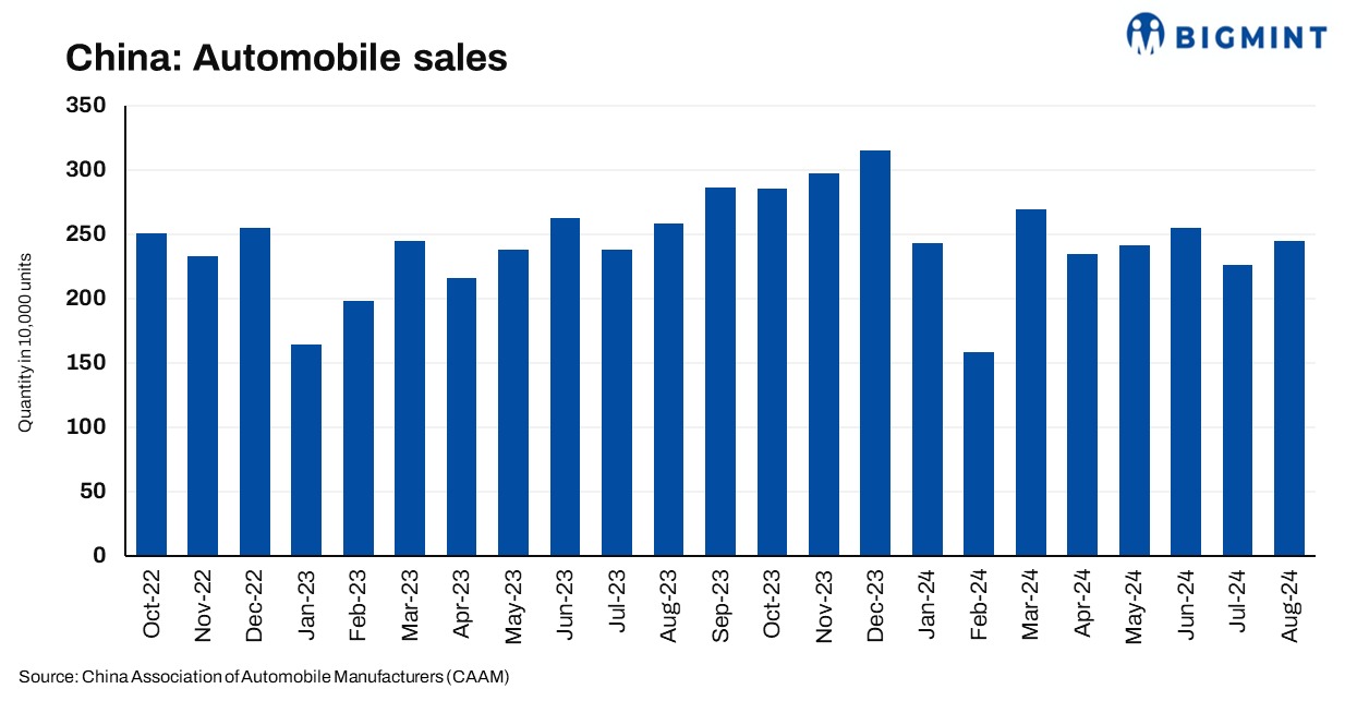 Chinese automobile sales in Aug’24 increased by 8.5% to 2.45 million units m-o-m as against 2.26 million units in Jul’24, as per data from the China Association of Automobile Manufacturers (CAAM). However, sales volumes saw a decline of 5% y-o-y as against 2.58 million units in Aug’23. During Jan-Aug’24, auto production and sales edged up by 2.5% and 3% y-o-y to 18.67 and 18.77 million units, respectively.