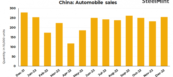 - China’s automobile sales rose by 9.7% m-o-m and 8.4% y-o-y to 2.55 million units in Dec’22, as per the China Association of Automobile Manufacturers.