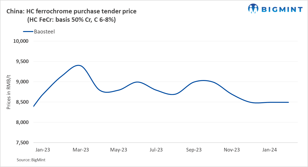Baosteel, one of the leading stainless steel producers in China, has kept its ferro chrome tender prices unchanged for Mar’24 deliveries at RMB 8,495/t ($1,197/t) DAP, including taxes, sources informed. It is evident that Baosteel has maintained steady prices since Dec’23 amid challenges in the stainless steel market.