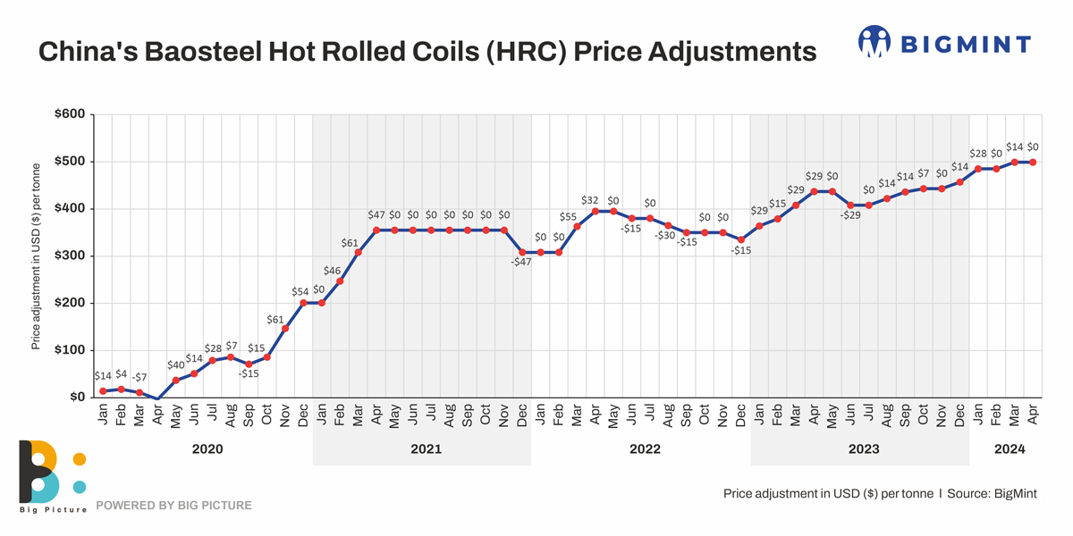 Baosteel has rolled over HRC and CRC prices for April’24 sales, after increasing in March’24, according to BigMint sources. Prices remained flat amid low domestic demand. However, prices for hot-dip galvanized (DQ level) has increased by RMB 100/t ($14/t). Furthermore, China’s SHFE HRC futures showed a mixed trend post-Chinese Lunar New Year holidays.