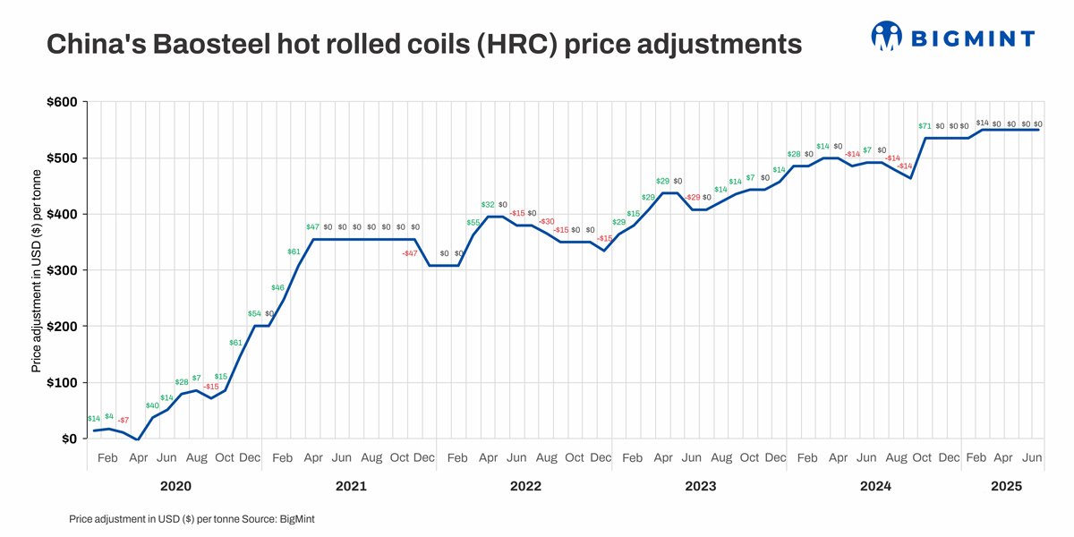 Baosteel, Chinese steel giant, has rolled over HRC prices for Jul’25 sales, continuing a trend of price stability for the fourth straight month, as per sources. Additionally, prices for hot-dip galvanised products remained steady. The price stability reflects weak domestic demand due to the Dragon Boat Festival, while overall market activity remained bearish.