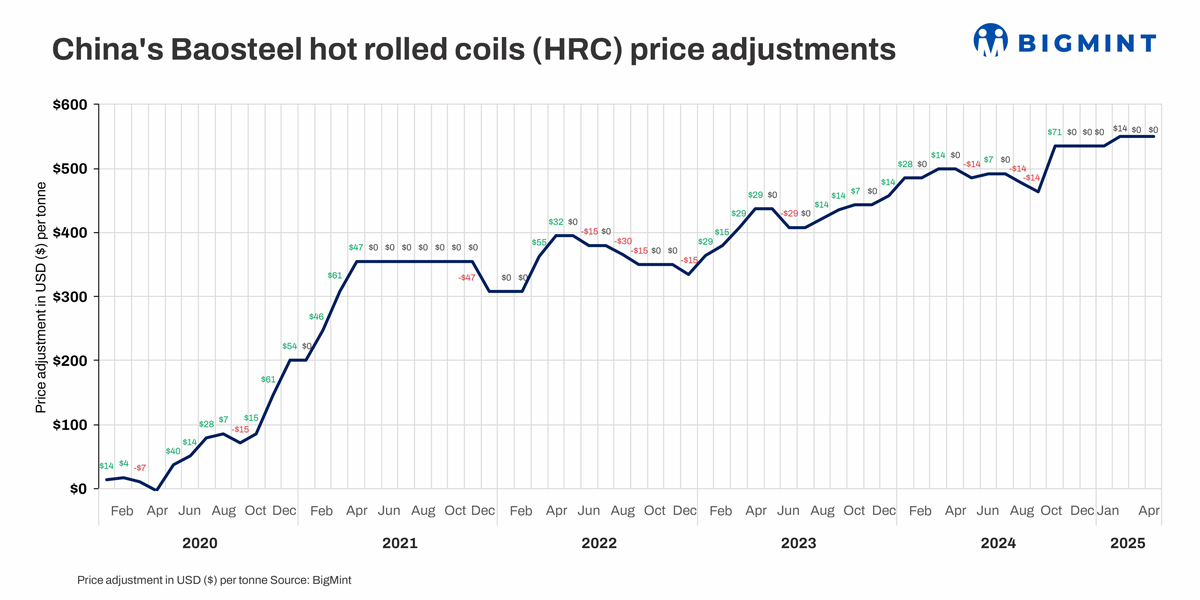 Baosteel, China’s steel giant, has rolled over HRC prices for May’25 sales, marking the second consecutive month of stability, according to BigMint’s sources. Additionally, hot-dip galvanised prices also remained unchanged. This stability comes amid mixed trends in SHFE HRC futures, influenced by weak domestic steel demand.