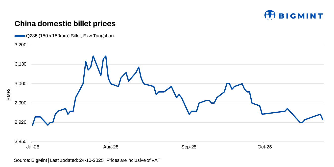 - Overall, the market was quiet. Billet prices fell amid weak rebar sales and subdued steel exports. Minor production cuts supported rates, with slight destocking following a 1% cut in mill output. Raw material inventories climbed, while coke remained firm.