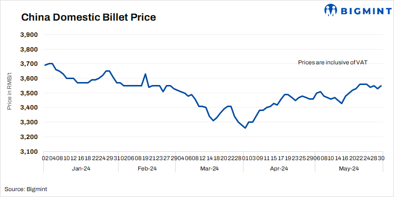 • Billet prices in Tangshan rose by RMB 20/t ($3/t) d-o-d to RMB 3,550/t ($490/t) on 30 May’24. Prices include 13% VAT.