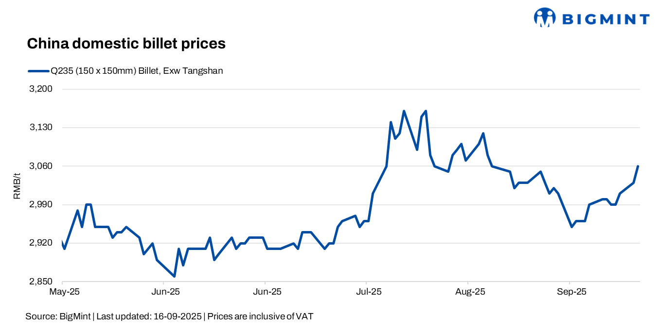 - Iron ore and coke prices strengthened by RMB 10-12/t ($2/t), supporting billet tags.