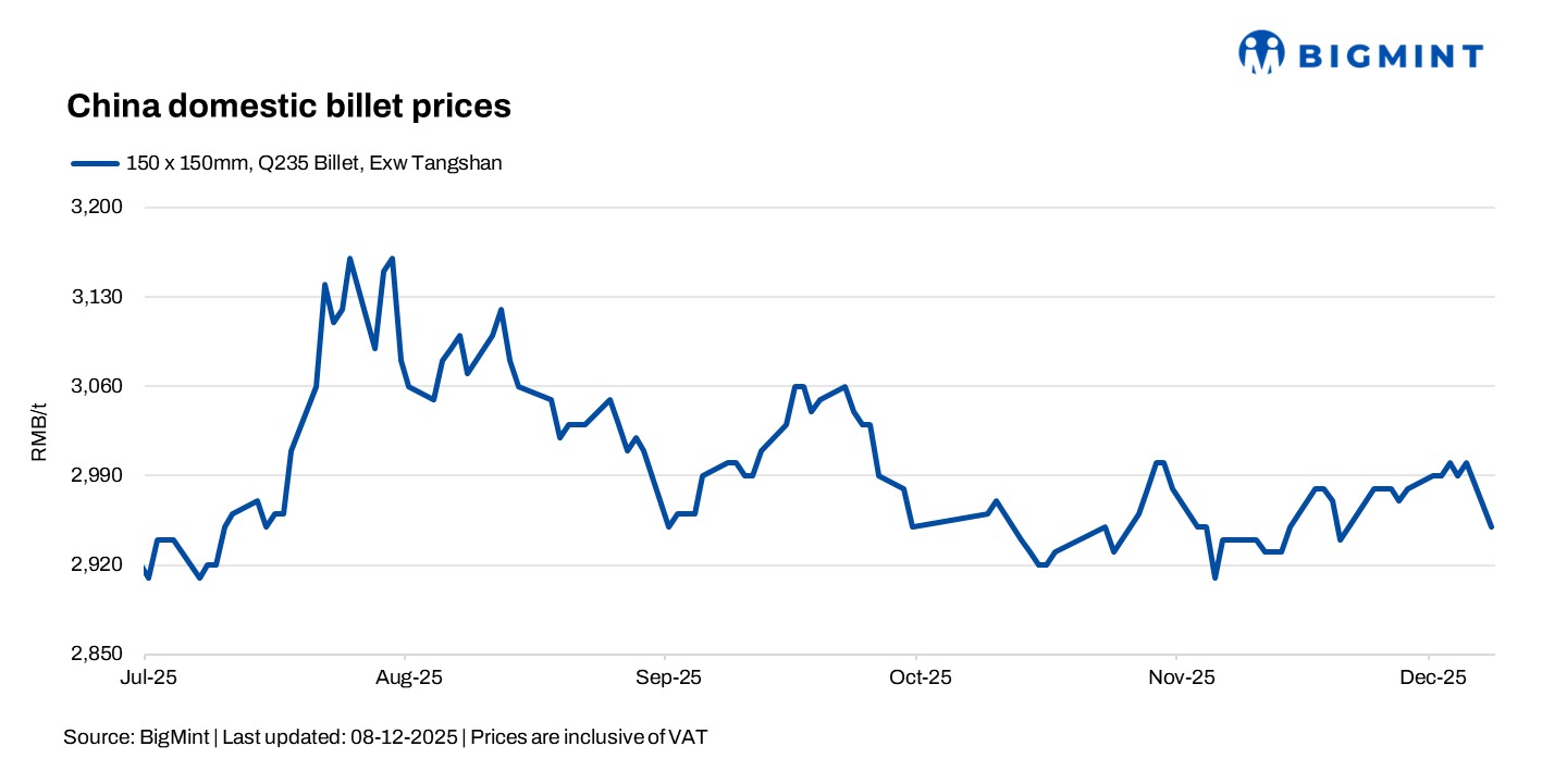 - Chinese billet prices fell by RMB 50/t ($7/t, 2%) to RMB 2,950/t ($424/t) on 8 Dec’25 as compared to 5 Dec , while SHFE rebar slipped by RMB 24/t ($3/t, 1%) to RMB 3,083/t ($439/t).