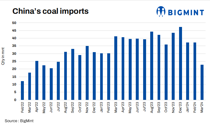 China’s coal imports from the seaborne market were recorded at 97.43 mnt in the first quarter of 2024, up 17% from 83.36 mnt in the same period in 2023. However, imports plummeted by 39% m-o-m to 22.91 mnt in Mar’24, compared to 37.26 mnt in Feb’24.