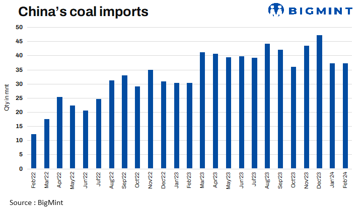 China’s coal imports rose by 23% y-o-y to 74.52 mnt in the first two months of CY’24 as against 60.64 in Jan-Feb’23. Chinese buying interest was on the higher side amid improved buying pattern due to Chinese heating season. The imports may not see significant rise in coming month as the temperatures have stabilised.