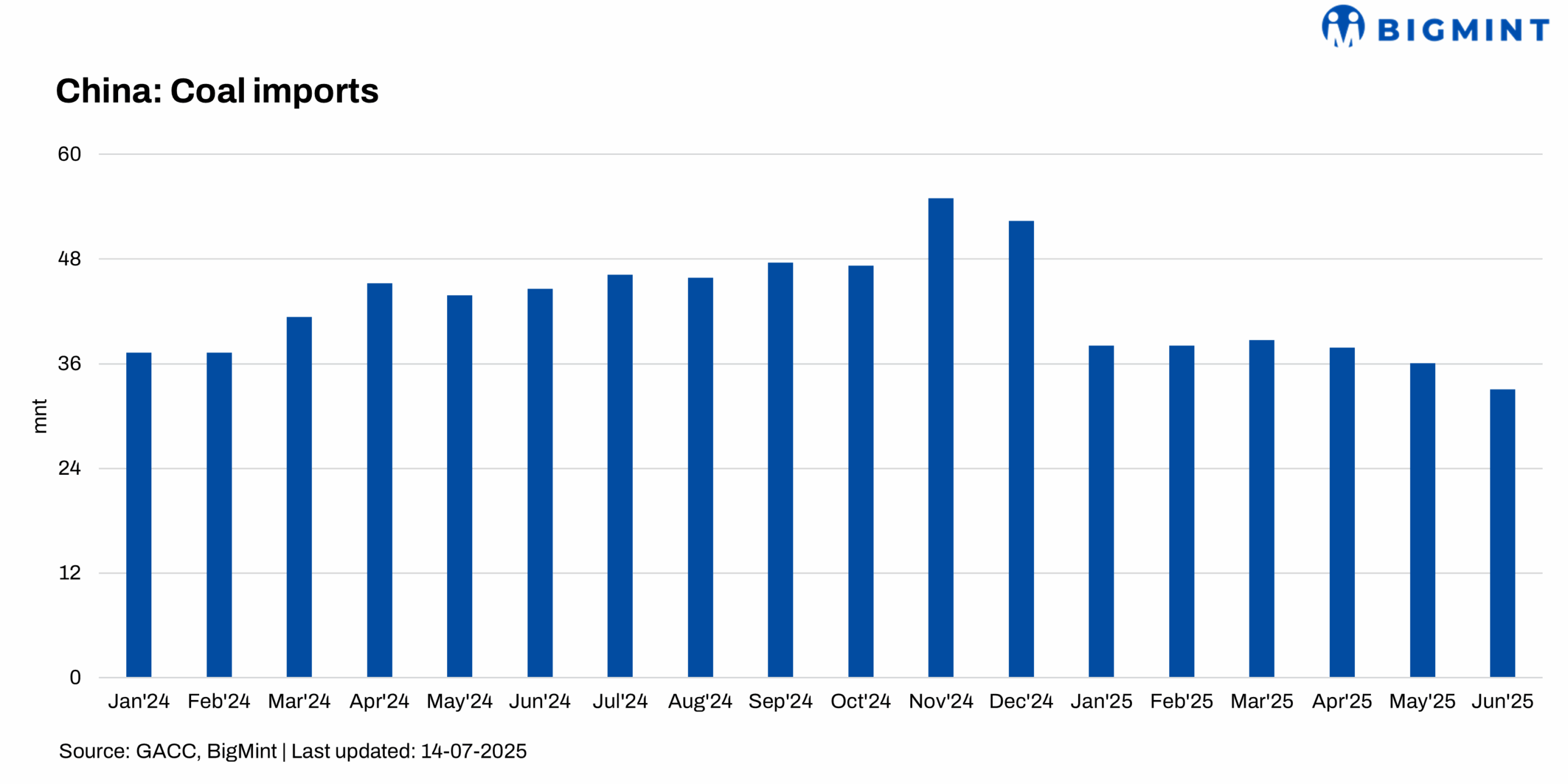 Lower coal demand from industrial users, particularly in steelmaking, may also be a factor. Crude steel production dropped 1.7% y-o-y to 431.6 mnt in January-May, while pig iron output declined 1.2% to 356.8 mnt.