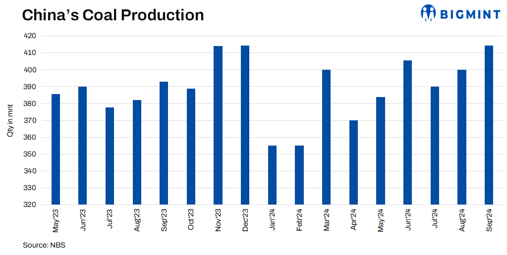 Mysteel Global: China’s output of all types of coal increased by a fast 4.4% y-o-y in September 2024 to reach 414.46 mnt, the highest level since April 2023, according to the latest release from China’s National Bureau of Statistics (NBS) on 18 October. The total was also higher by 4.5% from that recorded in August.