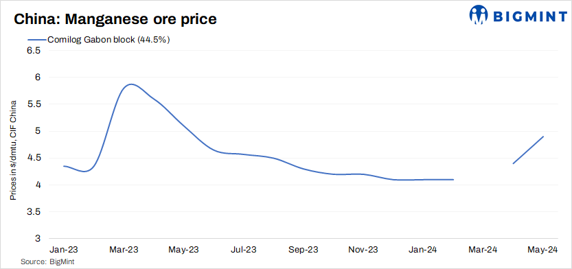 Comilog, one of the leading global manganese ore miners and a subsidiary of Eramet, has increased its Gabonese lumps (Mn 44.5%) prices to $4.90/dmtu, up 0.50/dmtu CIF China for May’24 shipments, sources informed. Constrained mine supply, coupled with China drawing down stockpiles, have provided underlying price support for the Mn ore.