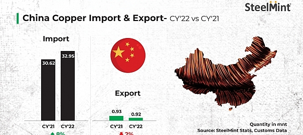 China’s imports of copper were recorded at 32.95 million tonnes (mnt) in Calendar Year (CY’22) against 30.62 mnt in CY’21, an increased by 8%. The export volume of China stood at 0.92 mnt in CY’22, a decrease of 2% as compared to CY’21 which was around 0.93 mnt.